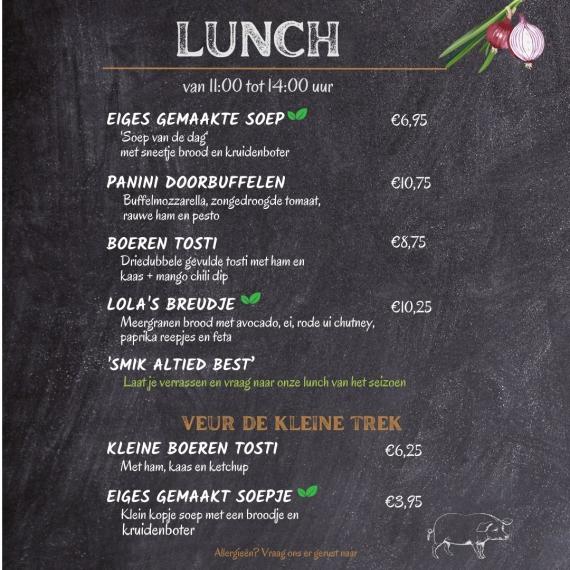 Hier geniet je van een geurige kop koffie met huisgemaakt gebak, of van een smakelijke lunch met streekproducten. Onze lunch wordt geserveerd van donderdag t/m zaterdag tussen 11.00 en 14.00 uur. Voor of na die tijd kun je terecht voor vers gebak, een hartige snack of verschillende smaken ambachtelijk ijs. Loat ’t oe smaken!