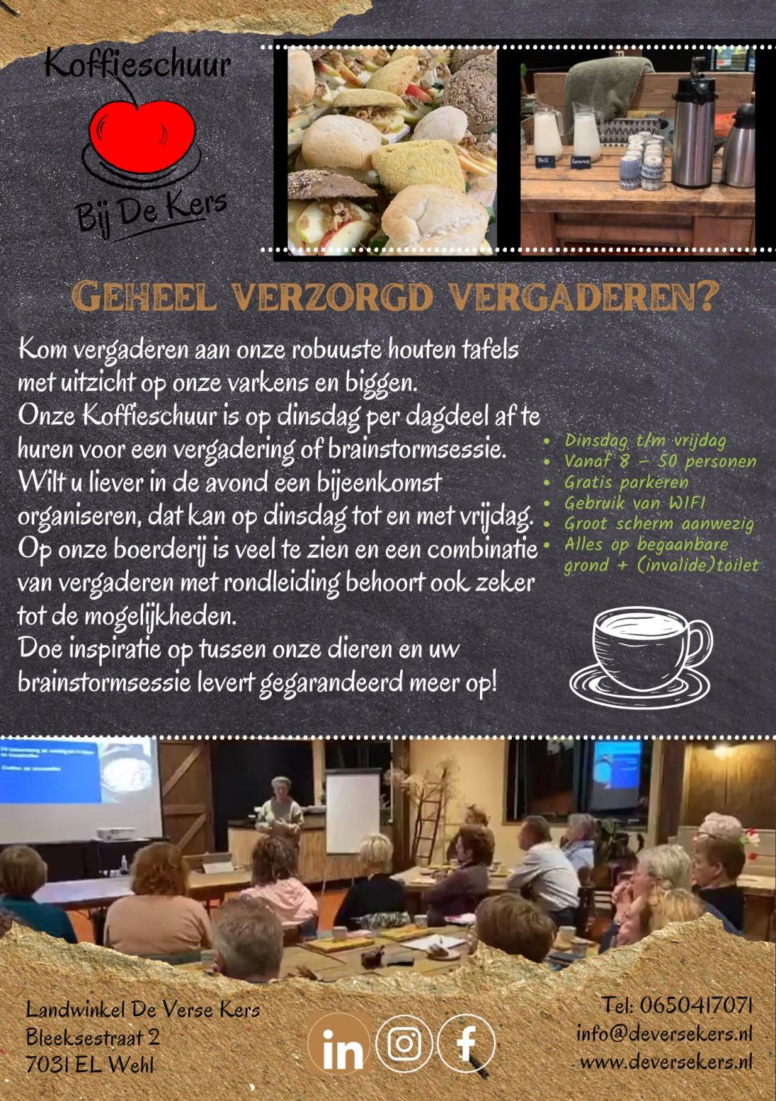 Bent u voor uw vereniging of werk op zoek naar een mooie plek om te kunnen vergaderen?  Onze Koffieschuur is overdag op dinsdag per dagdeel af te huren voor een vergadering, brainstormsessie of workshop. Wilt u liever in de avond een bijeenkomst organiseren, dat kan op dinsdag tot en met vrijdag.